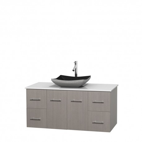 48 inch Single Bathroom Vanity in Gray Oak, White Man-Made Stone Countertop, Altair Black Granite Sink, and No Mirror