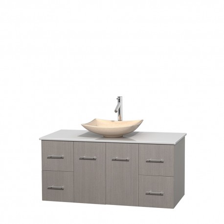 48 inch Single Bathroom Vanity in Gray Oak, White Man-Made Stone Countertop, Arista Ivory Marble Sink, and No Mirror
