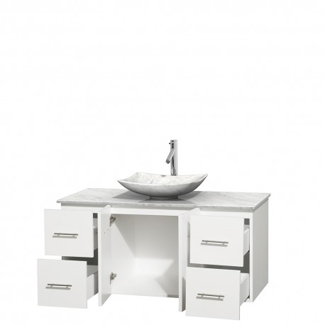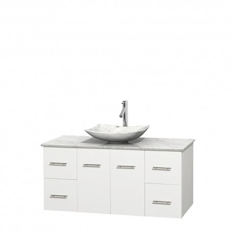 48 inch Single Bathroom Vanity in Matte White, White Carrera Marble Countertop, Arista White Carrera Marble Sink, and No Mirror
