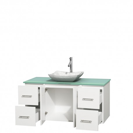48 inch Single Bathroom Vanity in Matte White, Green Glass Countertop, Avalon White Carrera Marble Sink, and No Mirror