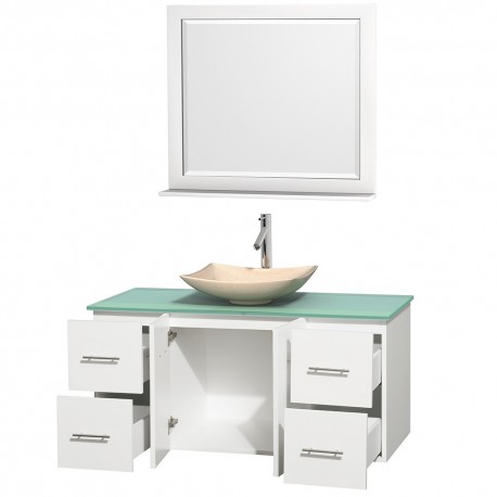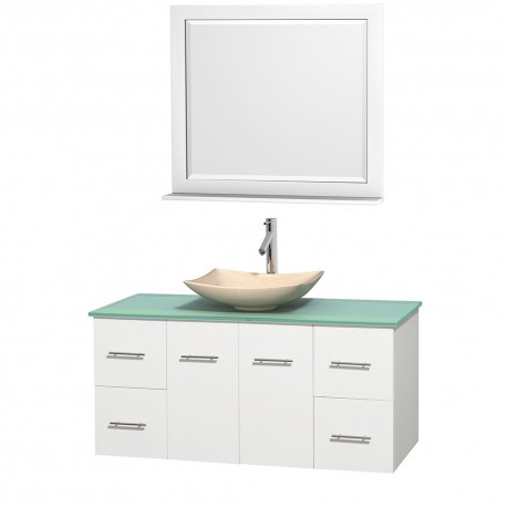 48 inch Single Bathroom Vanity in Matte White, Green Glass Countertop, Arista Ivory Marble Sink, and 36 inch Mirror