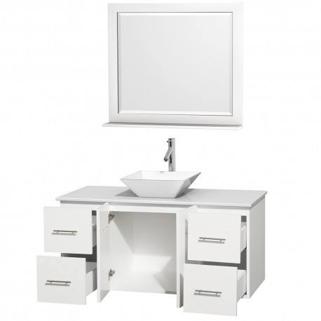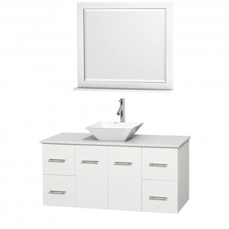 48 inch Single Bathroom Vanity in Matte White, White Man-Made Stone Countertop, Pyra White Porcelain Sink, and 36 inch Mirror