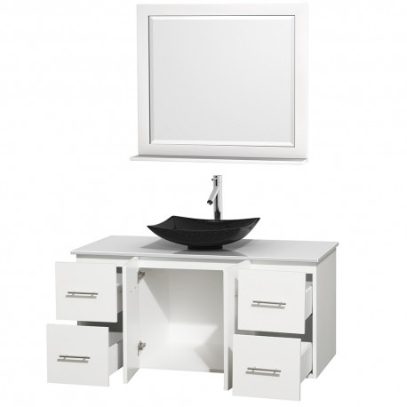 48 inch Single Bathroom Vanity in Matte White, White Man-Made Stone Countertop, Arista Black Granite Sink, and 36 inch Mirror