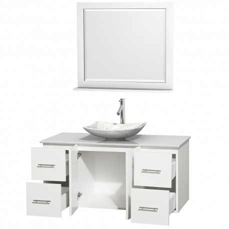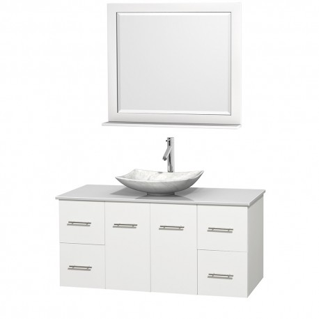 48 inch Single Bathroom Vanity in Matte White, White Man-Made Stone Countertop, Arista White Carrera Marble Sink, and 36 inch Mirror