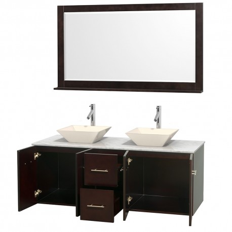 60 inch Double Bathroom Vanity in Espresso, White Carrera Marble Countertop, Pyra Bone Porcelain Sinks, and 58 inch Mirror
