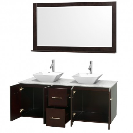 60 inch Double Bathroom Vanity in Espresso, White Carrera Marble Countertop, Pyra White Porcelain Sinks, and 58 inch Mirror