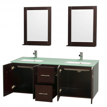 60 inch Double Bathroom Vanity in Espresso, Green Glass Countertop, Undermount Square Sink, and 24 inch Mirrors