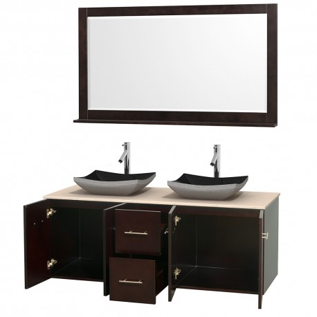 60 inch Double Bathroom Vanity in Espresso, Ivory Marble Countertop, Altair Black Granite Sinks, and 58 inch Mirror