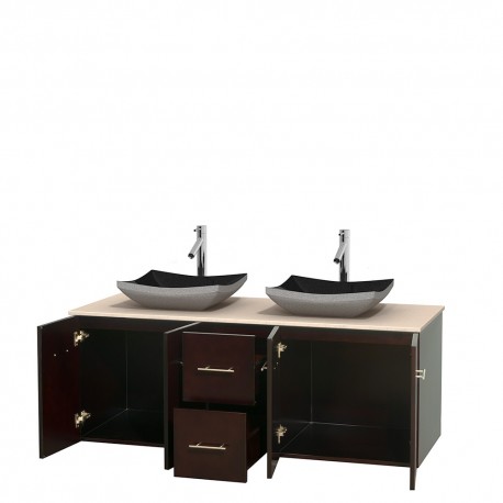 60 inch Double Bathroom Vanity in Espresso, Ivory Marble Countertop, Altair Black Granite Sinks, and No Mirror