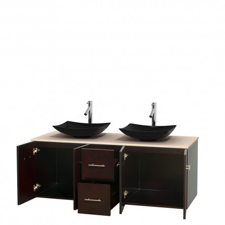60 inch Double Bathroom Vanity in Espresso, Ivory Marble Countertop, Arista Black Granite Sinks, and No Mirror