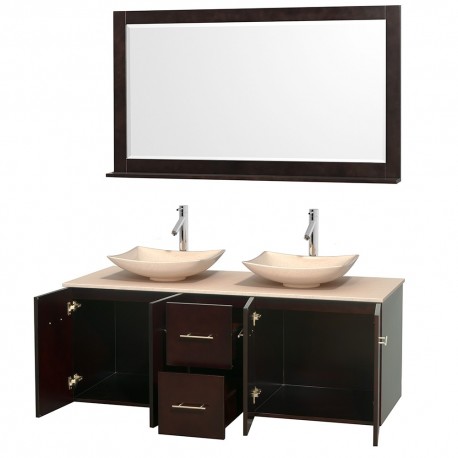 60 inch Double Bathroom Vanity in Espresso, Ivory Marble Countertop, Arista Ivory Marble Sinks, and 58 inch Mirror