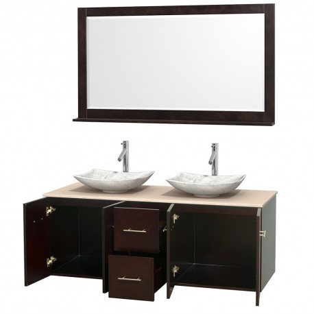 60 inch Double Bathroom Vanity in Espresso, Ivory Marble Countertop, Arista White Carrera Marble Sinks, and 58 inch Mirror