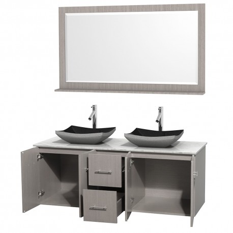 60 inch Double Bathroom Vanity in Gray Oak, White Carrera Marble Countertop, Altair Black Granite Sinks, and 58 inch Mirror