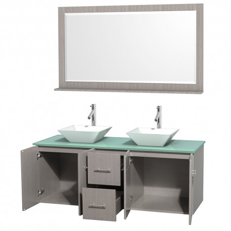 60 inch Double Bathroom Vanity in Gray Oak, Green Glass Countertop, Pyra White Porcelain Sinks, and 58 inch Mirror