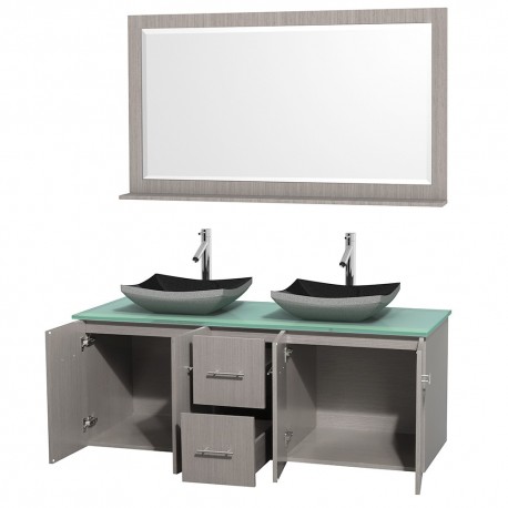 60 inch Double Bathroom Vanity in Gray Oak, Green Glass Countertop, Altair Black Granite Sinks, and 58 inch Mirror