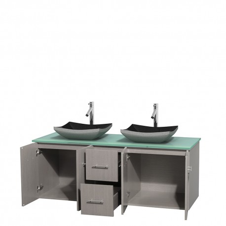 60 inch Double Bathroom Vanity in Gray Oak, Green Glass Countertop, Altair Black Granite Sinks, and No Mirror