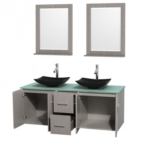 60 inch Double Bathroom Vanity in Gray Oak, Green Glass Countertop, Arista Black Granite Sinks, and 24 inch Mirrors
