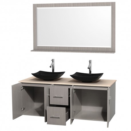 60 inch Double Bathroom Vanity in Gray Oak, Ivory Marble Countertop, Arista Black Granite Sinks, and 58 inch Mirror