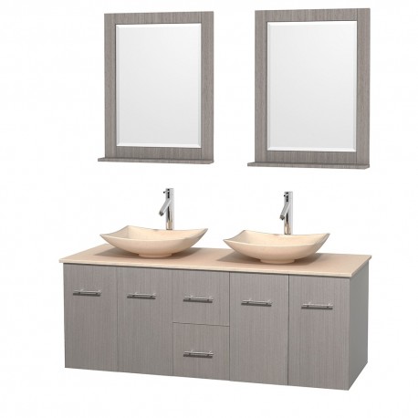 60 inch Double Bathroom Vanity in Gray Oak, Ivory Marble Countertop, Arista Ivory Marble Sinks, and 24 inch Mirrors