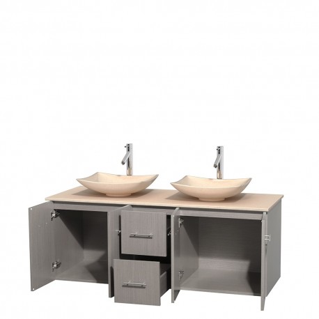 60 inch Double Bathroom Vanity in Gray Oak, Ivory Marble Countertop, Arista Ivory Marble Sinks, and No Mirror