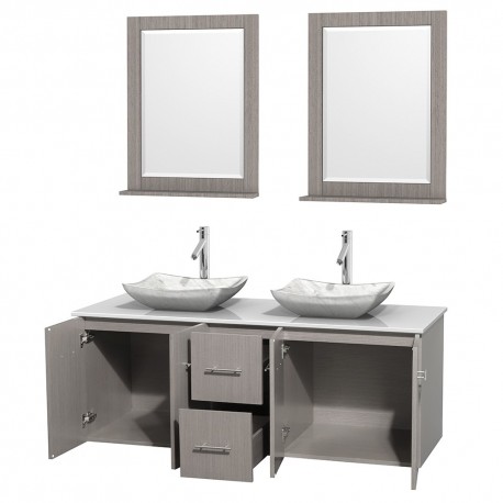 60 inch Double Bathroom Vanity in Gray Oak, White Man-Made Stone Countertop, Avalon White Carrera Marble Sinks, and 24 inch Mirrors