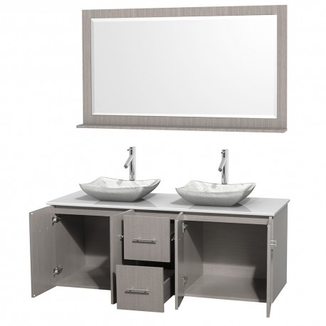 60 inch Double Bathroom Vanity in Gray Oak, White Man-Made Stone Countertop, Avalon White Carrera Marble Sinks, and 58 inch Mirror