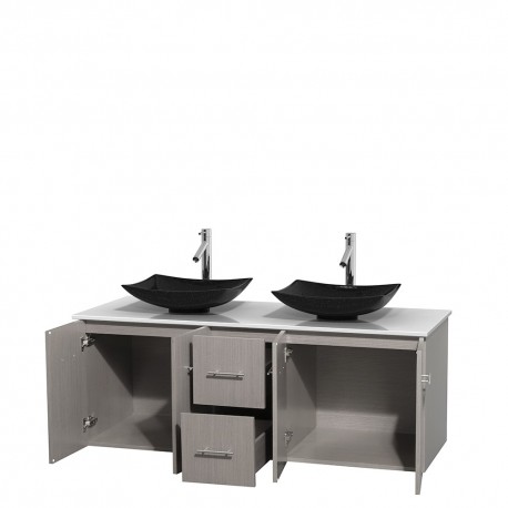 60 inch Double Bathroom Vanity in Gray Oak, White Man-Made Stone Countertop, Arista Black Granite Sinks, and No Mirror