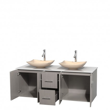 60 inch Double Bathroom Vanity in Gray Oak, White Man-Made Stone Countertop, Arista Ivory Marble Sinks, and No Mirror