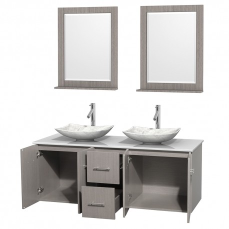 60 inch Double Bathroom Vanity in Gray Oak, White Man-Made Stone Countertop, Arista White Carrera Marble Sinks, and 24 inch Mirrors