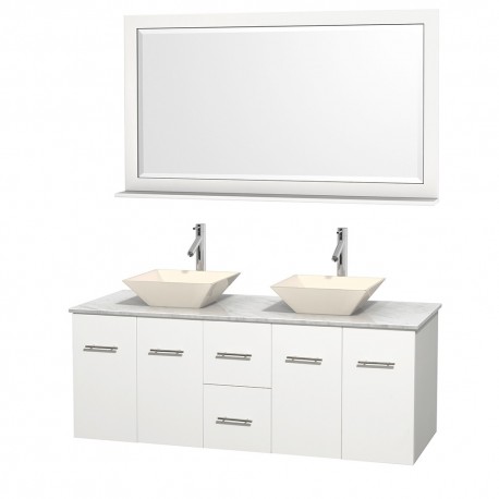 60 inch Double Bathroom Vanity in Matte White, White Carrera Marble Countertop, Pyra Bone Porcelain Sinks, and 58 inch Mirror