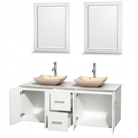 60 inch Double Bathroom Vanity in Matte White, White Carrera Marble Countertop, Avalon Ivory Marble Sinks, and 24 inch Mirrors