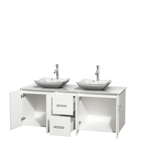 60 inch Double Bathroom Vanity in Matte White, White Carrera Marble Countertop, Avalon White Carrera Marble Sinks, and No Mirror