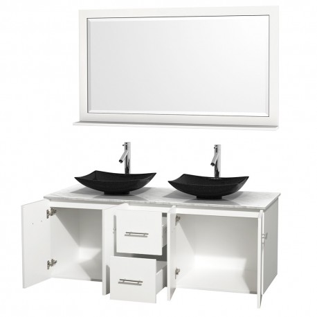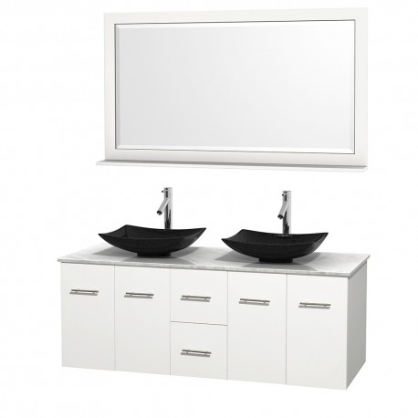 60 inch Double Bathroom Vanity in Matte White, White Carrera Marble Countertop, Arista Black Granite Sinks, and 58 inch Mirror