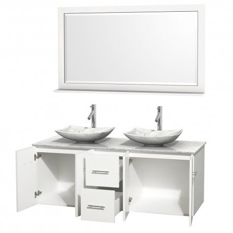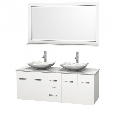 60 inch Double Bathroom Vanity in Matte White, White Carrera Marble Countertop, Arista White Carrera Marble Sinks, and 58 inch Mirror