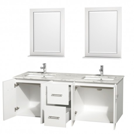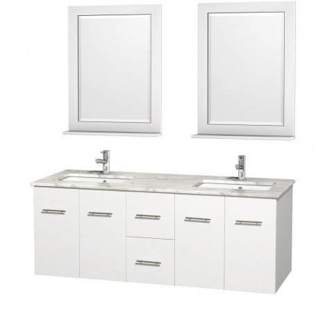 60 inch Double Bathroom Vanity in Matte White, White Carrera Marble Countertop, Undermount Square Sink, and 24 inch Mirrors