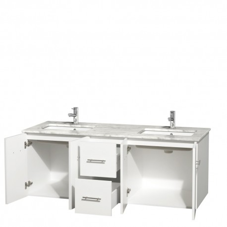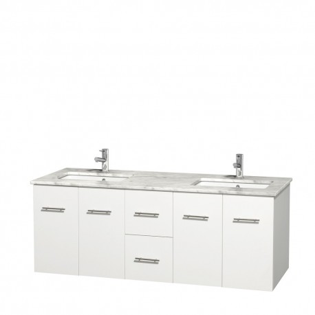 60 inch Double Bathroom Vanity in Matte White, White Carrera Marble Countertop, Undermount Square Sinks, and No Mirror