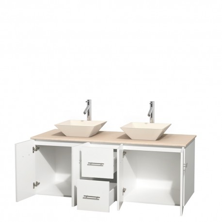 60 inch Double Bathroom Vanity in Matte White, Ivory Marble Countertop, Pyra Bone Porcelain Sinks, and No Mirror