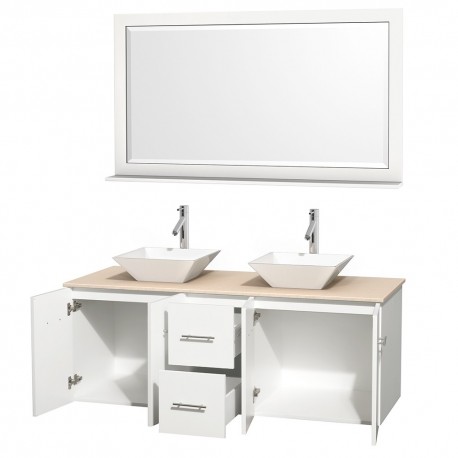 60 inch Double Bathroom Vanity in Matte White, Ivory Marble Countertop, Pyra White Porcelain Sinks, and 58 inch Mirror