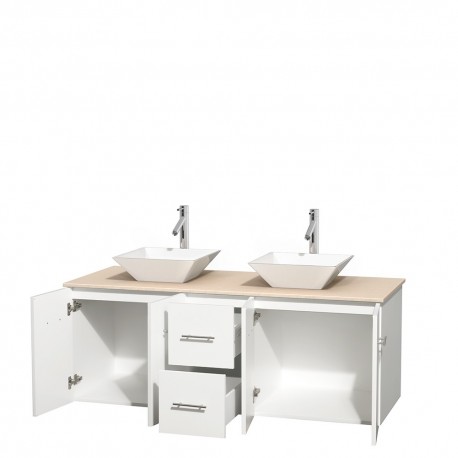 60 inch Double Bathroom Vanity in Matte White, Ivory Marble Countertop, Pyra White Porcelain Sinks, and No Mirror