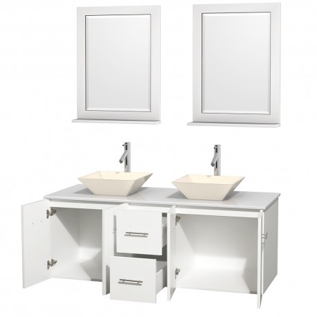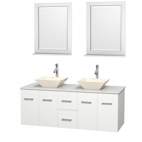 60 inch Double Bathroom Vanity in Matte White, White Man-Made Stone Countertop, Pyra Bone Porcelain Sinks, and 24 inch Mirrors