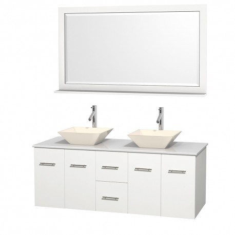 60 inch Double Bathroom Vanity in Matte White, White Man-Made Stone Countertop, Pyra Bone Porcelain Sinks, and 58 inch Mirror