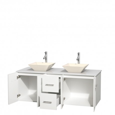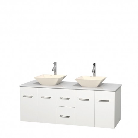 60 inch Double Bathroom Vanity in Matte White, White Man-Made Stone Countertop, Pyra Bone Porcelain Sinks, and No Mirror