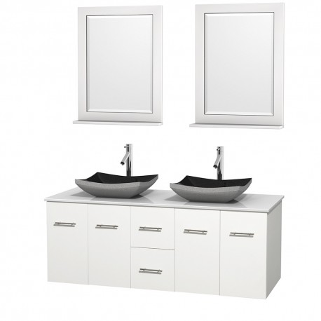 60 inch Double Bathroom Vanity in Matte White, White Man-Made Stone Countertop, Altair Black Granite Sinks, and 24 inch Mirrors