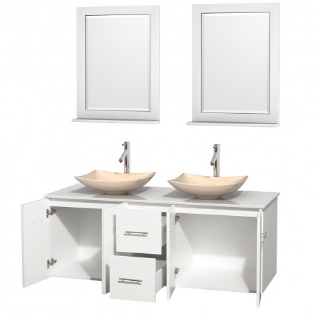 60 inch Double Bathroom Vanity in Matte White, White Man-Made Stone Countertop, Arista Ivory Marble Sinks, and 24 inch Mirrors