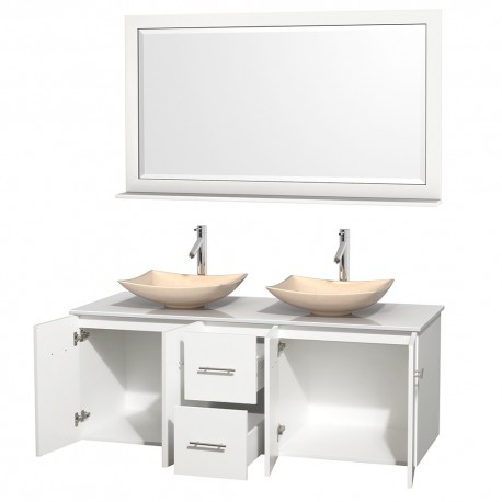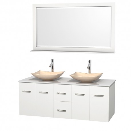 60 inch Double Bathroom Vanity in Matte White, White Man-Made Stone Countertop, Arista Ivory Marble Sinks, and 58 inch Mirror