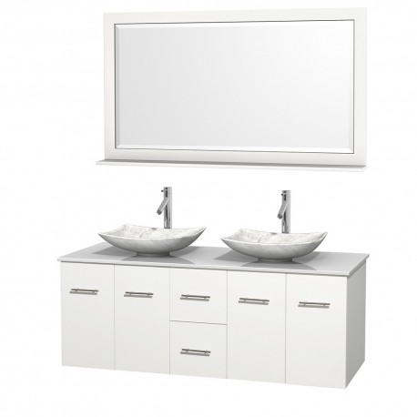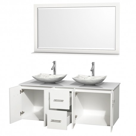 60 inch Double Bathroom Vanity in Matte White, White Man-Made Stone Countertop, Arista White Carrera Marble Sinks, and 58 inch Mirror