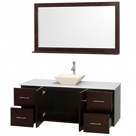 60 inch Single Bathroom Vanity in Espresso, White Man-Made Stone Countertop, Pyra Bone Porcelain Sink, and 58 inch Mirror