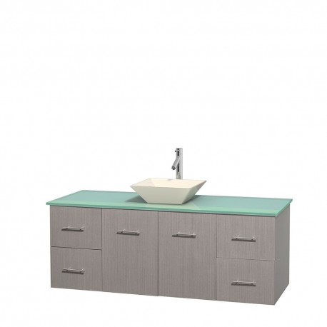 60 inch Single Bathroom Vanity in Gray Oak, Green Glass Countertop, Pyra Bone Porcelain Sink, and No Mirror