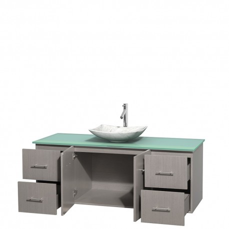 60 inch Single Bathroom Vanity in Gray Oak, Green Glass Countertop, Arista White Carrera Marble Sink, and No Mirror