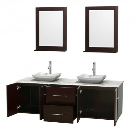 72 inch Double Bathroom Vanity in Espresso, White Carrera Marble Countertop, Avalon White Carrera Marble Sinks, and 24 inch Mirrors
